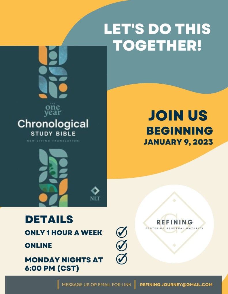 We are pleased to announce a new approach to studying the Bible in 2023. After several years of offering Bible studies entitled “Experiencing the Power of God’s Word” and conducting small focused sessions online, we felt led to go beyond the normal cycle of Bible study. Therefore, we are spending the entire year offering an opportunity to enhance Bible literacy through a chronological view for anyone wanting to join us.